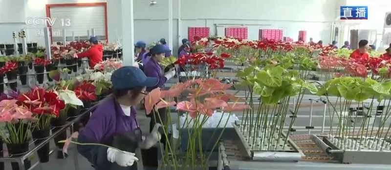 The reporter visited the largest cut flower planting base in Shaanxi Province, specifically their packaging workshop. As you can see, eight production lines behind me are operating at high speed, with workers skillfully sorting and packaging the flowers. Each New Year's flower takes only one hour from harvest to finished product, ensuring it's shipped to destinations across the country in maximum freshness. On the other side of the workshop, the e-commerce live-streaming area is also bustling with activity. Live streamers are recommending this year's New Year's flower gift boxes to consumers through online platforms. This "online and offline integrated supply guarantee" model enhances the factory's ability to quickly respond to market demands.