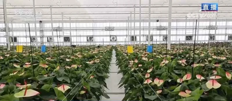The plant in the reporter's hand, resembling an open palm, is called an anthurium. It boasts a long vase life, vibrant colors, and easy care, and carries auspicious meanings such as good fortune, prosperity, and happiness. Therefore, it has gradually become a new favorite in the Lunar New Year flower market and is currently the main Lunar New Year flower variety supplied by this base. It's worth noting that anthuriums originally only grow in tropical rainforests, preferring heat and disliking cold. So why can it bloom profusely and mature on time according to market demand in Xi'an, northern China? The answer lies in this 50,000-square-meter intelligent greenhouse not far from the reporter.