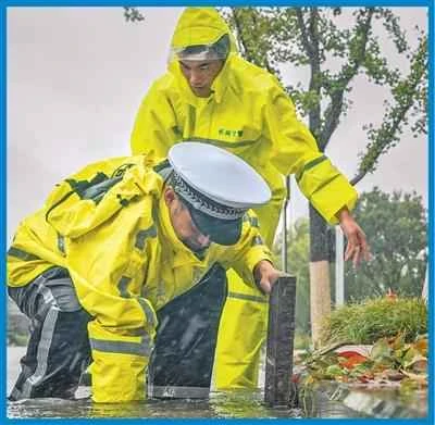 Police officers and auxiliary police officers from the Changxing County Public Security Bureau in Huzhou City, Zhejiang Province, braved heavy rain to clear drainage outlets. (Photo by Fang Jinhua/Visual China)