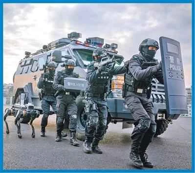 Members of the Special Police Detachment of the Mianyang Public Security Bureau in Sichuan Province, in coordination with police robot dogs, conducted a realistic combat drill. (Photo by Tang Chao/Visual China)