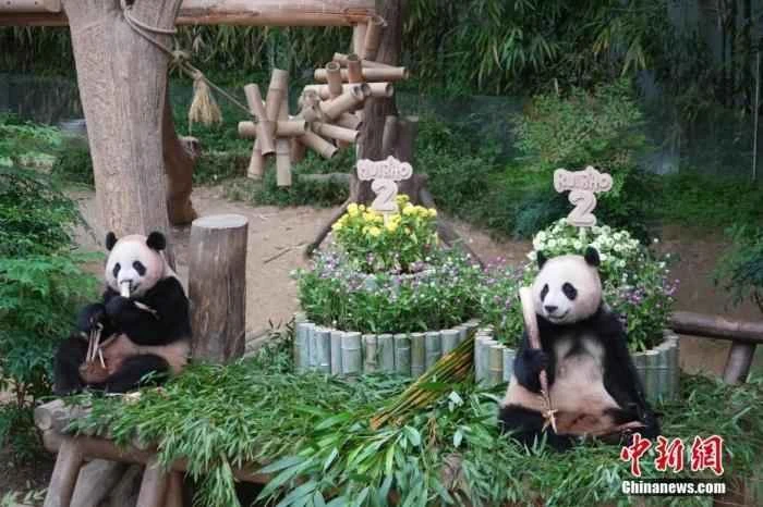 On July 7, 2025, the female giant panda twins "Rui Bao" and "Hui Bao," born in South Korea, celebrated their second birthday. Everland, located in Yongin, South Korea, held a birthday celebration for them. The photo shows giant pandas "Rui Bao" (left) and "Hui Bao" at their birthday party.